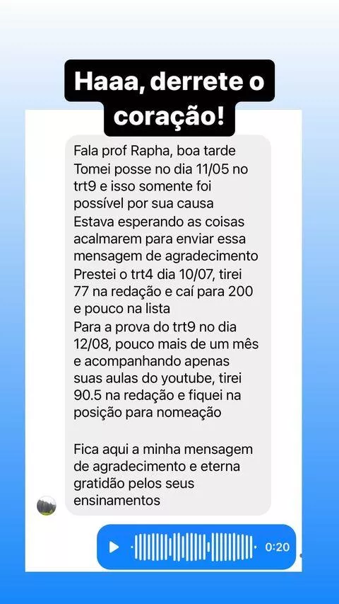 Sou considerado referência nacional na redação de concursos públicos. Meu sucesso se deve ao desempenho extraordinário dos meus alunos, que sempre conquistam as melhores notas em concursos de alto nível!